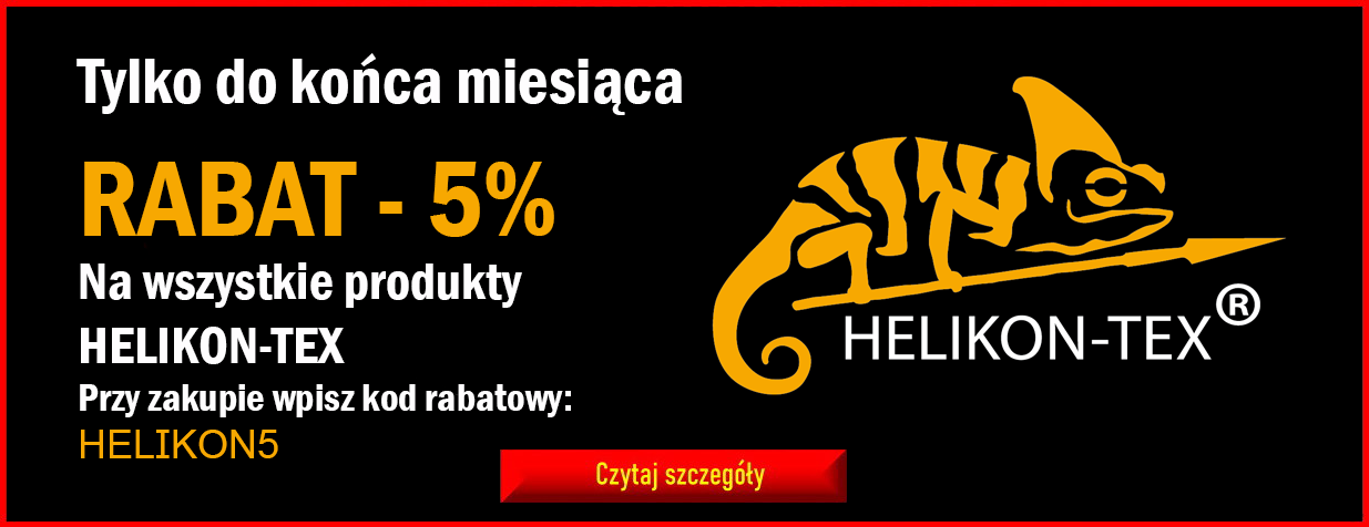Żeby dokonać zakupu produktów marki HELIKON-TEX z rabatem -5%, podczas dokonywania zakupów w koszyku z wybranymi towarami marki Helikon-Tex wpisz KOD RABATOWY (DUŻYMI LITERAMI) o treści: HELIKON5 Kod rabatowy na produkty HELIKON-TEX dotyczy tylko zakupów detalicznych jest ważny tylko dla zakupów zarejestrowanych przez stronę sklepu: military-zone sklep.pl, a także dla klientów bezpośrednio dokonujących zakupu produktów marki Helikon-Tex w sklepie stacjonarnym w Żywcu. Wówczas należy poinformować sprzedawcę o chęci z skorzystania rabatu HELIKON5, rabatu udzieli sprzedawca podczas płatności za towar marki Helikon.