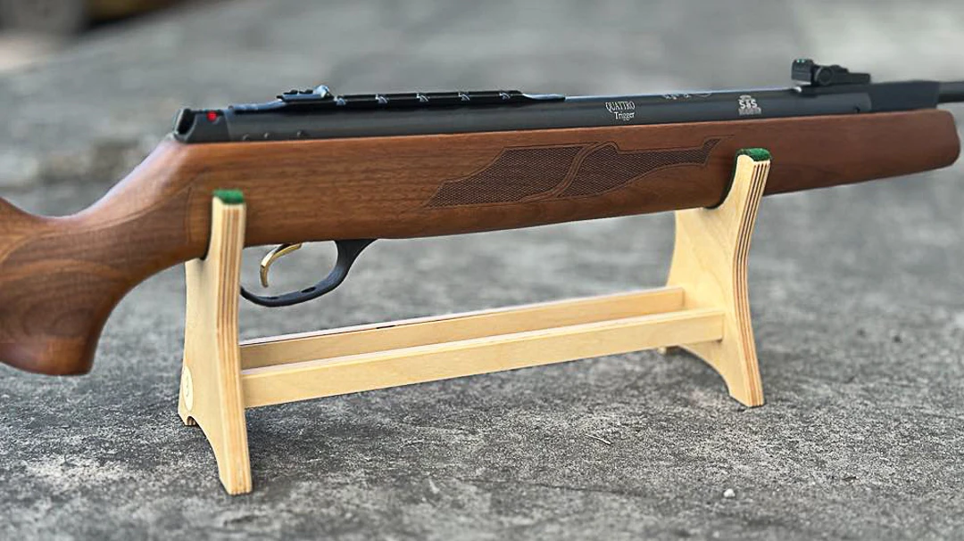 Prezentujemy stojak wykonany ze sklejki, który doskonale nadaje się do ekspozycji kwiatrówki lub innej broni długiej. To elegancki i praktyczny sposób na prezentację Twojej kolekcji broni - wiatróweki itp.
