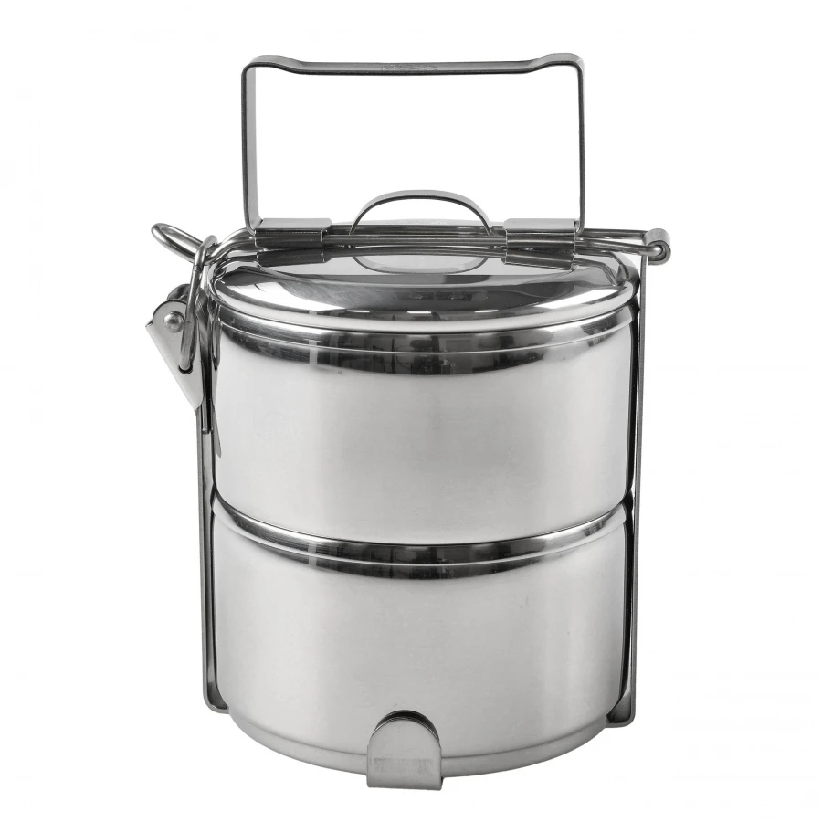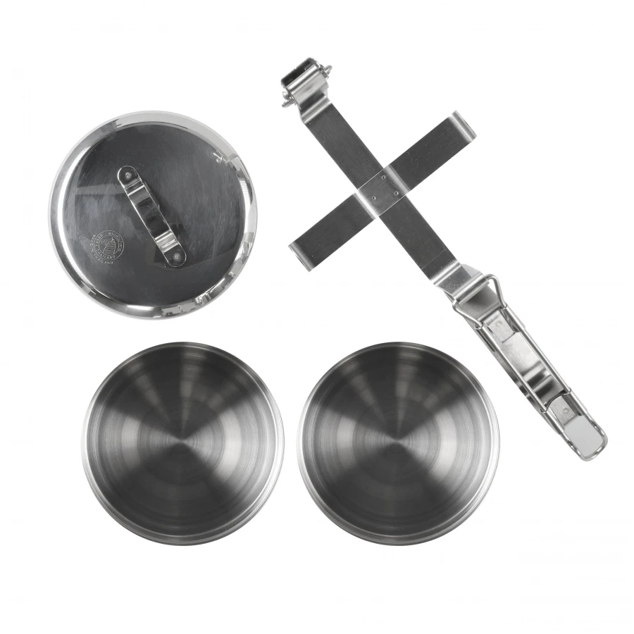 Garnki są ze sobą łączone za pomocą specjalnego uchwytu transportowego, który utrzymuje całość w stabilnej pozycji podczas przenoszenia.