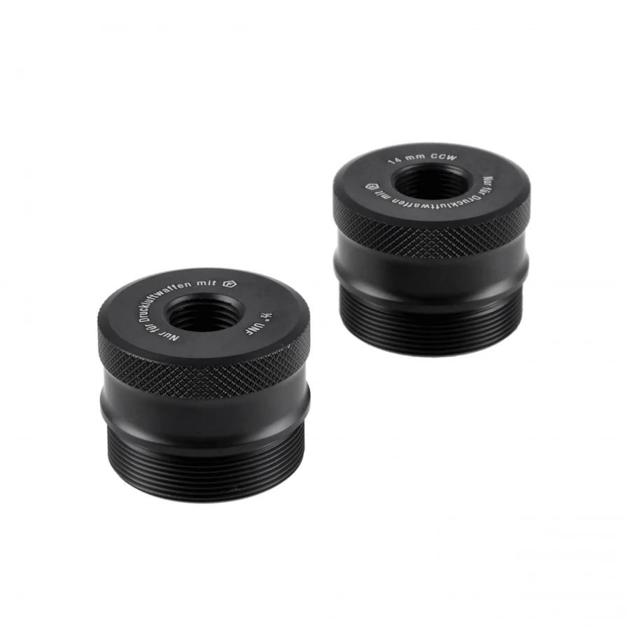 Aby zapewnić szeroką kompatybilność z różnymi modelami wiatrówek, tłumik wyposażono w dwa adaptery gwintu: 14 mm lewy (CCW) oraz ½″-20 UNF.