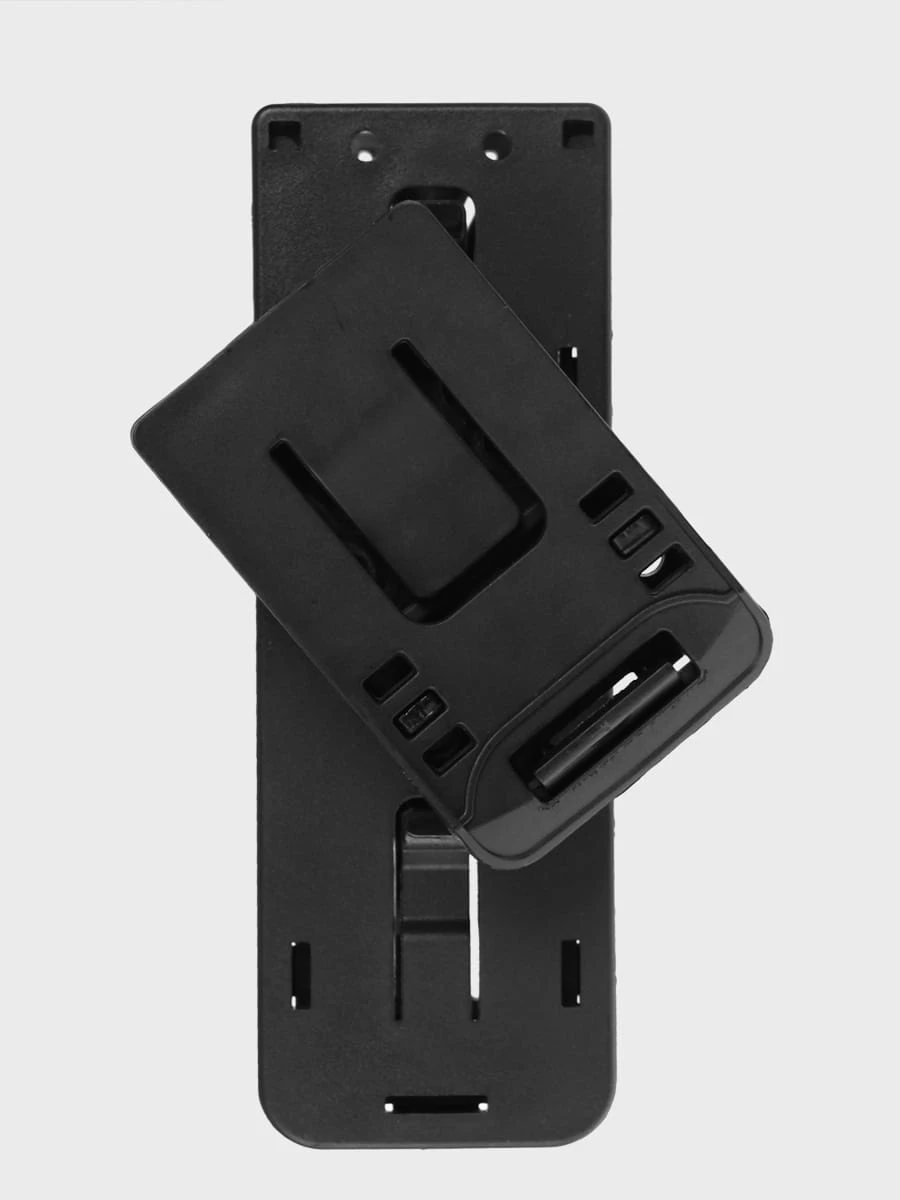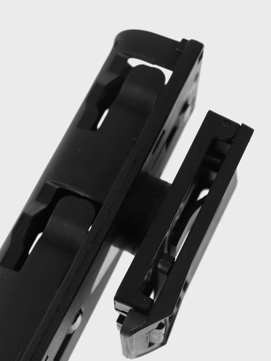 Mocowanie kabury pasuje do pasów o szerokości do 60 mm, a dzięki zastosowaniu regulowanej belki dystansowej można ją łatwo dostosować do szerokości pasa 38 mm, 45 mm lub 51 mm. Zapewnia to pewne, stabilne mocowanie, które utrzymuje kaburę w miejscu nawet podczas intensywnego ruchu.