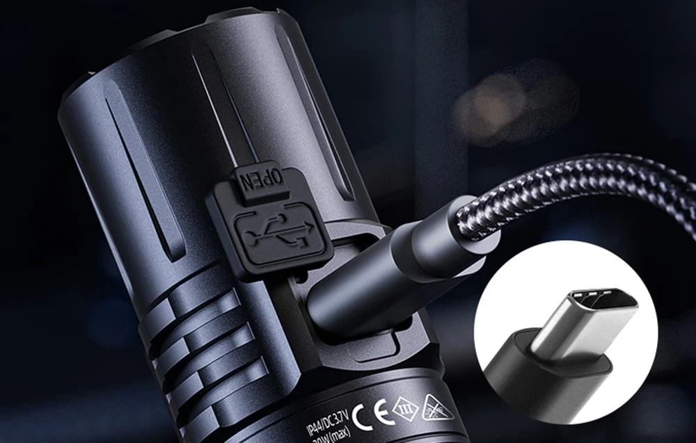 Latarka Superfire A20 jest kompatybilna z kilkoma typami baterii, w tym 21700, 18650 oraz trzema bateriami AAA (potrójna A, standardowa mała bateria cylindryczna 1,5 V) co daje użytkownikowi dużą elastyczność w zakresie wyboru źródła zasilania. Wbudowany port ładowania USB-C (Universal Serial Bus typu C, uniwersalne złącze do przesyłania danych i zasilania) umożliwia szybkie i efektywne ładowanie za pomocą różnorodnych urządzeń, takich jak komputery, powerbanki i ładowarki ścienne. Wskaźnik ładowania LED (Light Emitting Diode, dioda elektroluminescencyjna) informuje użytkownika o stanie baterii – czerwone światło oznacza, że bateria jest w trakcie ładowania, natomiast niebieskie sygnalizuje pełne naładowanie.