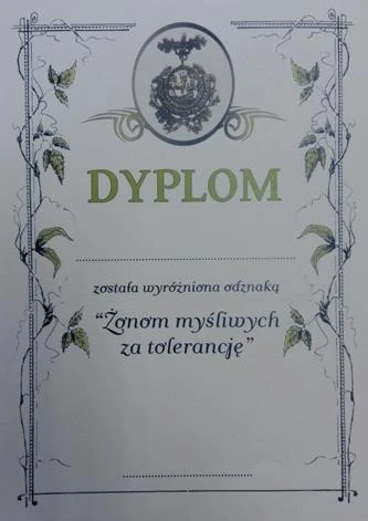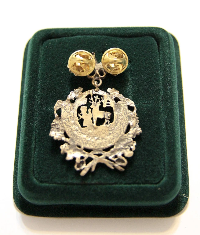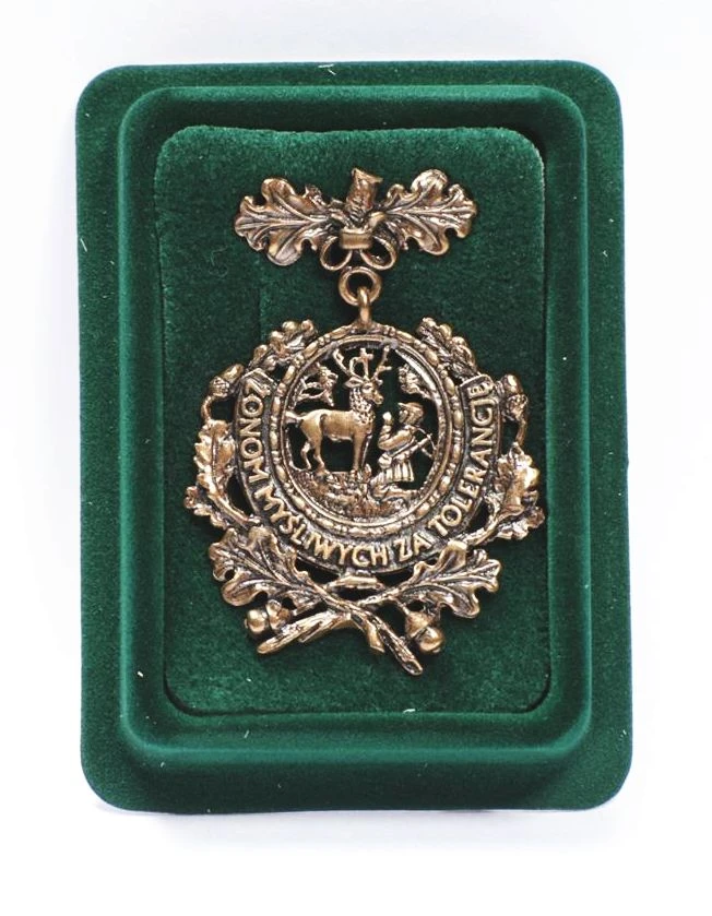 Odznaka ukazuje świętego Huberta podczas objawienia, napis „ ŻONOM MYŚLIWYCH ZA TOLERANCJĘ”, a wszystko to otoczone dębowym laurem.