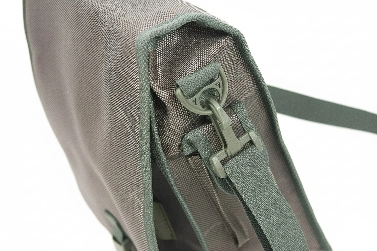 Główna komora dodatkowo wyposażona była w dyskretną kieszonkę, zapinaną na zamek błyskawiczny na dokumenty czy telefon. Z przodu torby znajdują się pętle na długopisy, latarkę itp. Na klapie od strony wewntrzej znajduje się foliowa kieszeń. Po bokach torby znajdziemy zgrabne kieszonki zamykane na rzep.
