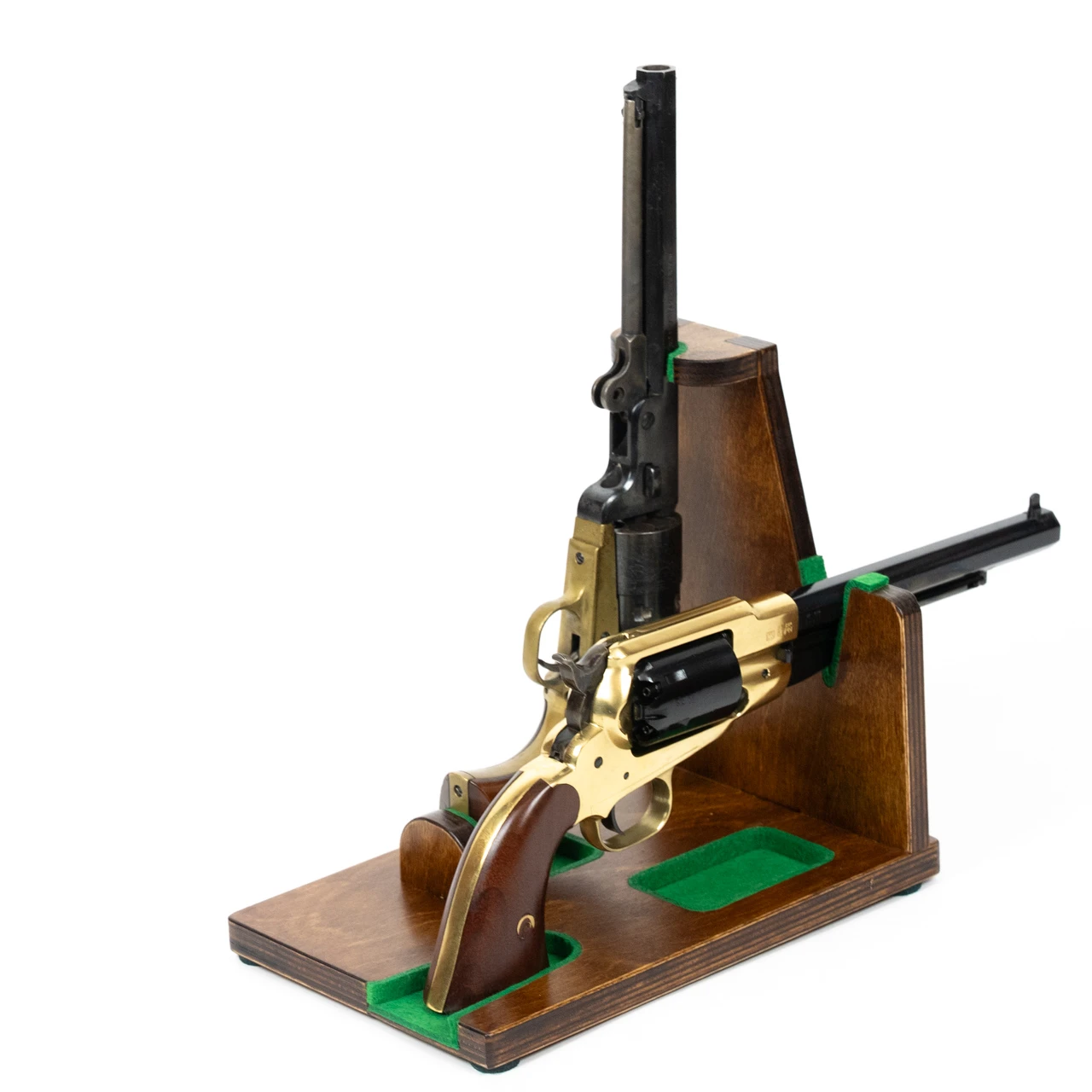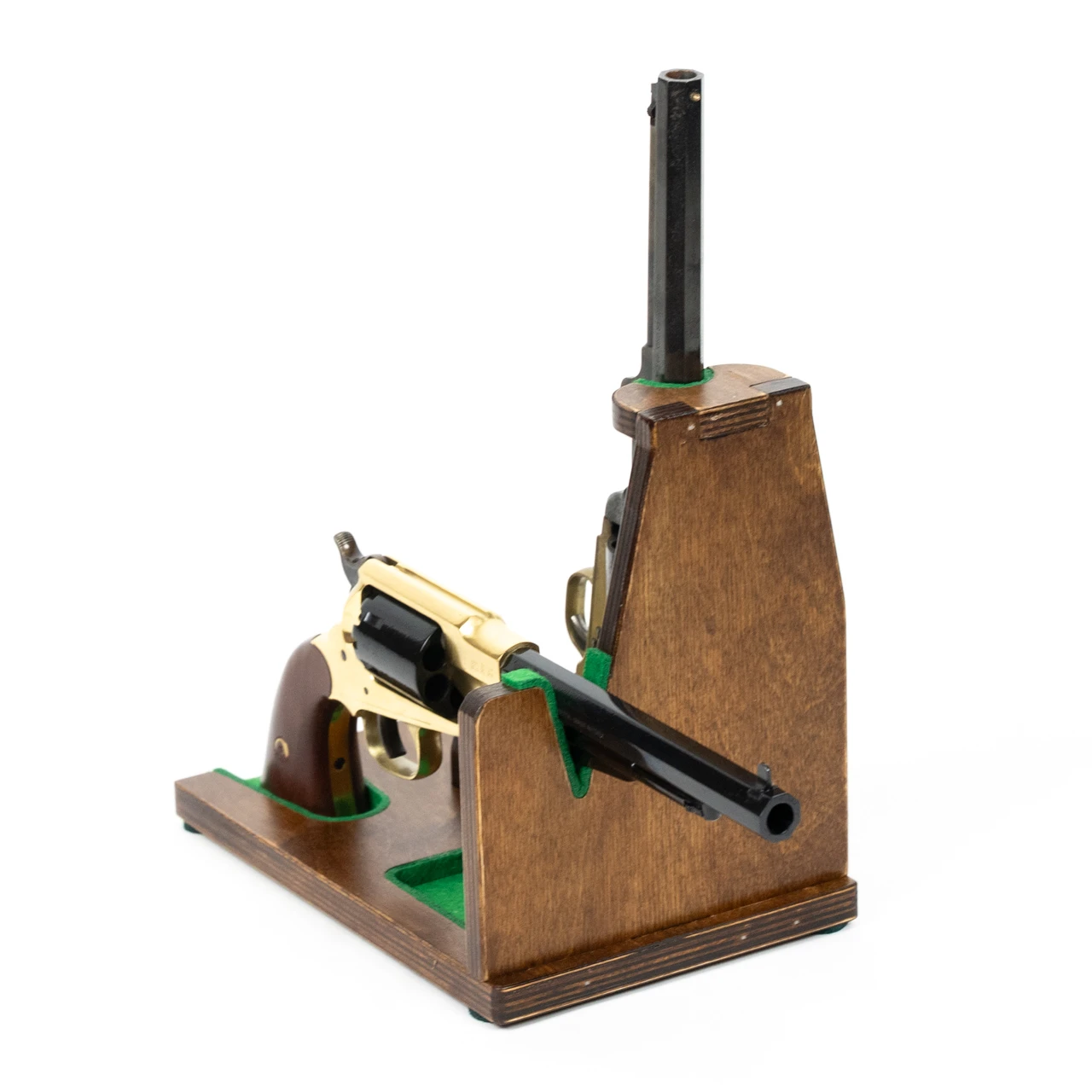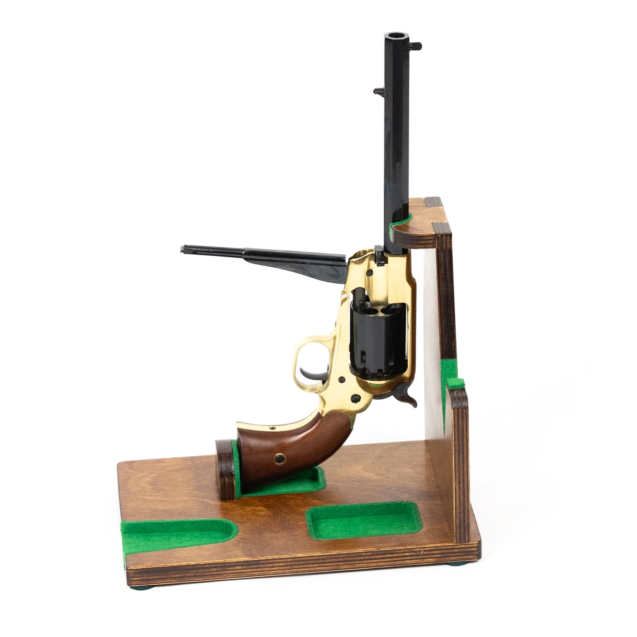 Stojak wykonany z becjowanej i lakierowanej sklejki, doskonale nadaje się do ekspozycji ulubionego rewolweru czarnoprochowego