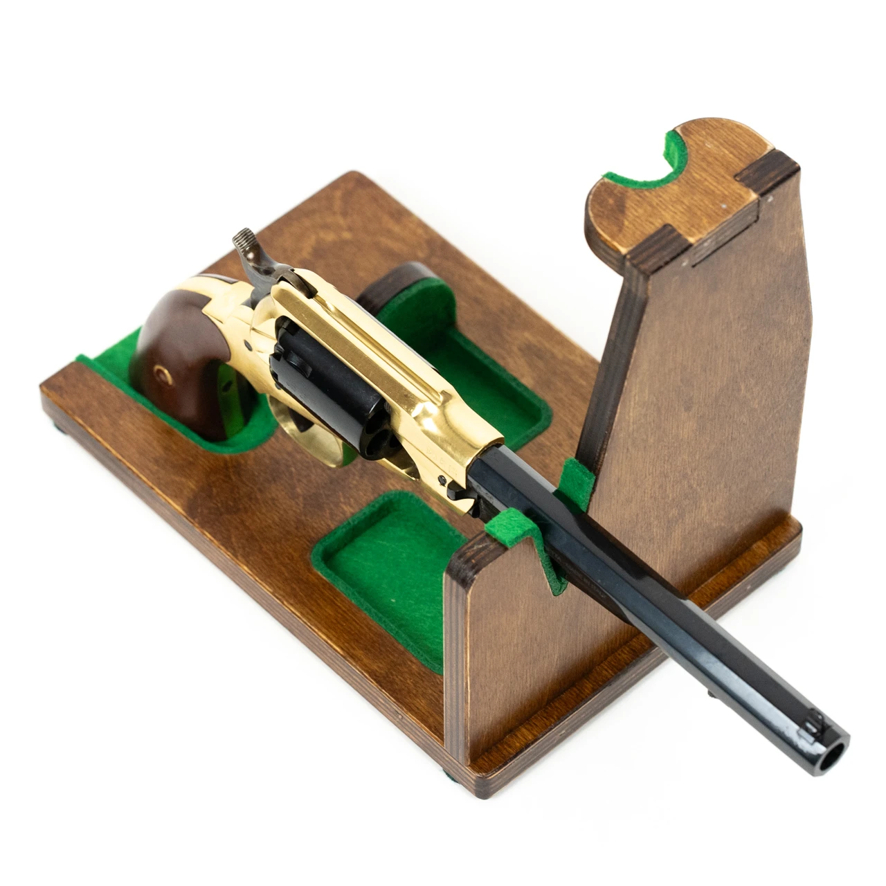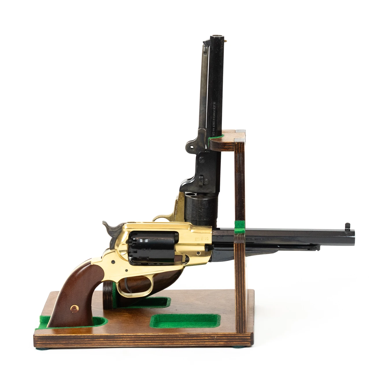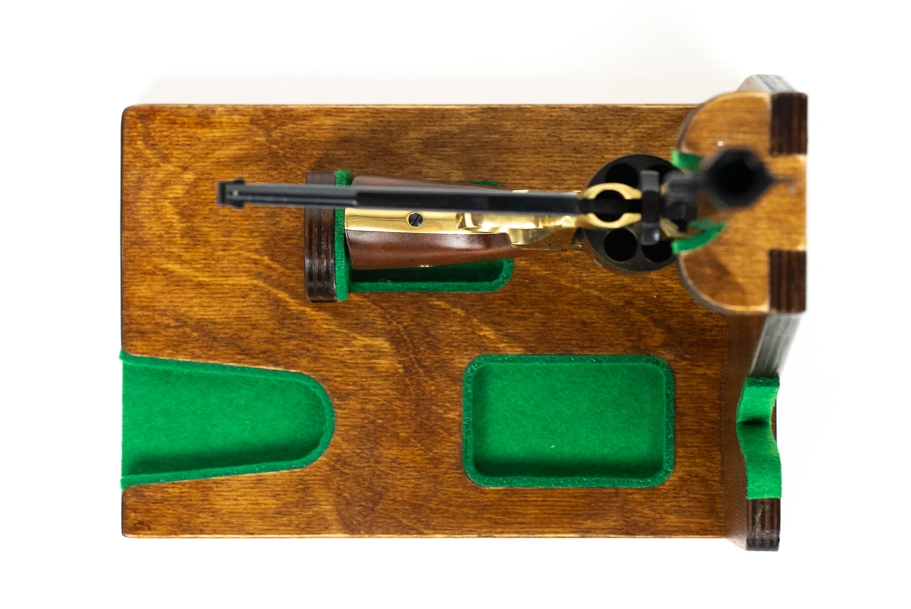 Stojak wykonany z becjowanej i lakierowanej sklejki, doskonale nadaje się do ekspozycji ulubionego rewolweru czarnoprochowego