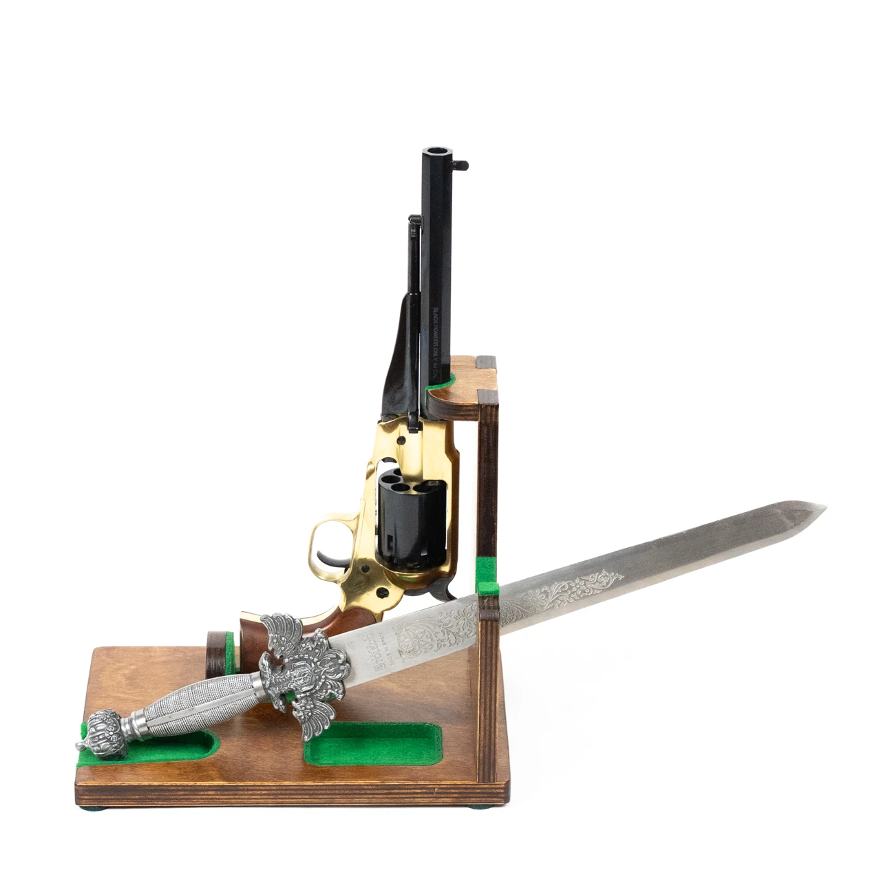 - Funkcjonalność: Stojak umożliwia eksponowanie różnych rodzai broni na stoliku, kominku itp. Istotnym elementem są filcowe podkładki, zabezpieczające broń przed porysowaniem.