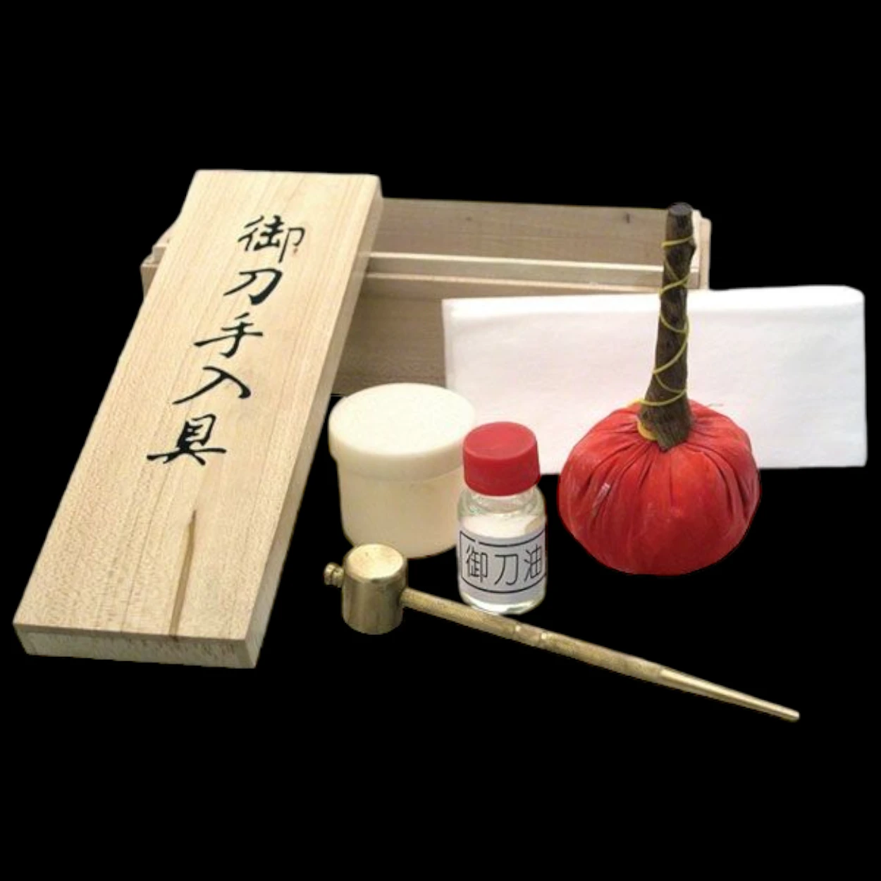 Kompletny zestaw do czyszczenia i konserwacji katany, stworzony z myślą o prawidłowej pielęgnacji tradycyjnego japońskiego miecza.