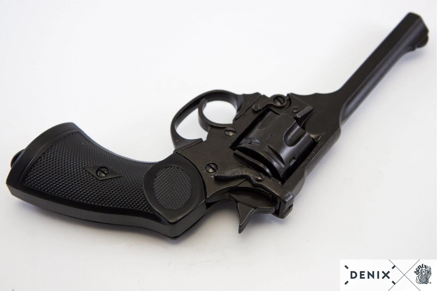 Ta wysokiej jakości imitacja rewolweru Webley Mk IV została wykonana z metalu oraz tworzywa sztucznego na uchwycie, dzięki czemu zachowuje zarówno autentyczny wygląd, jak i komfort użytkowania. Model wyposażono w symulowany mechanizm ładowania i strzelania oraz obrotowy bębenek, co pozwala w pełni odczuć realizm historycznej broni, jednocześnie zachowując pełne bezpieczeństwo.