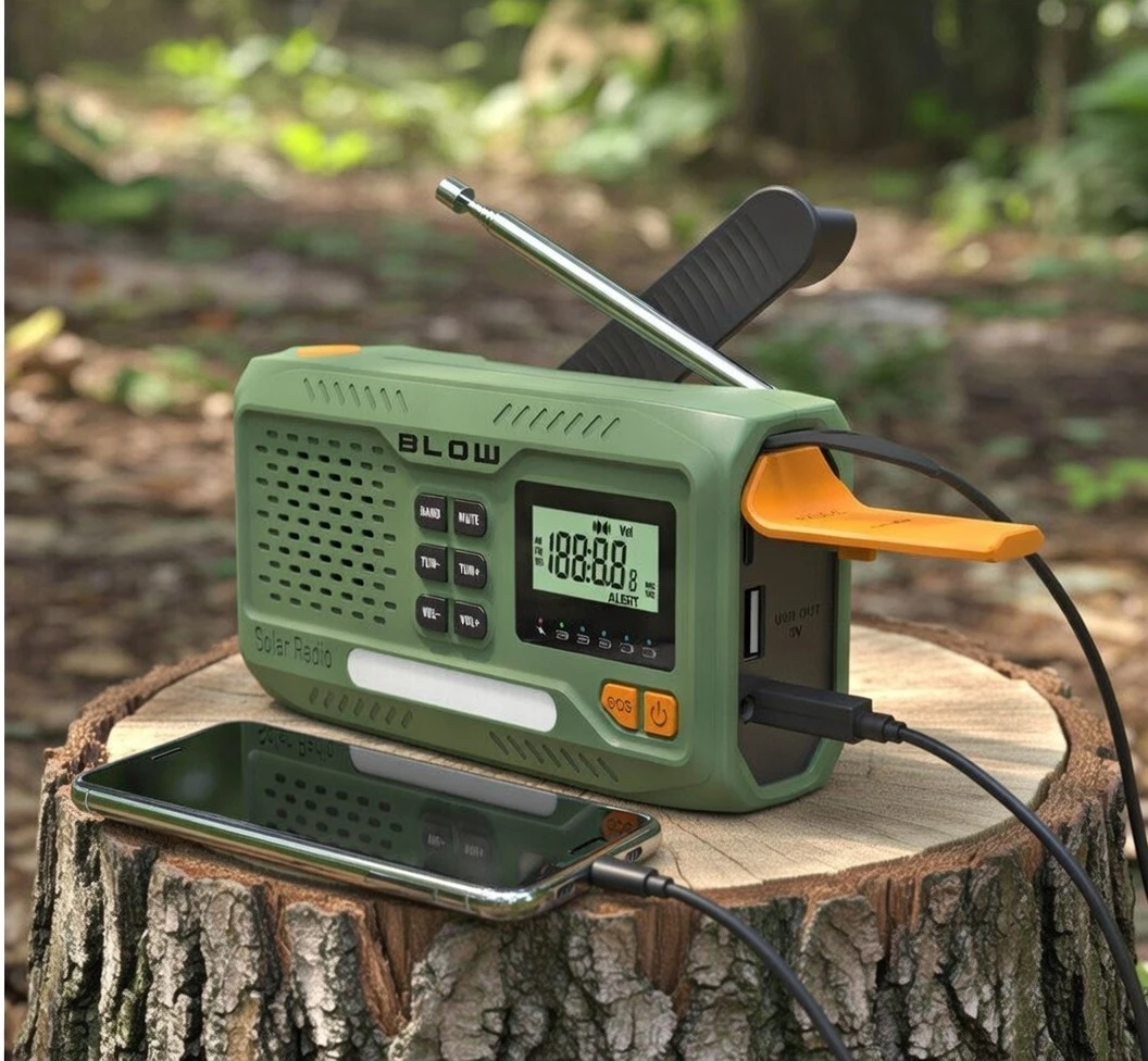Radio przenośne solarne z dynamem, latarką LED i sygnałem SOS