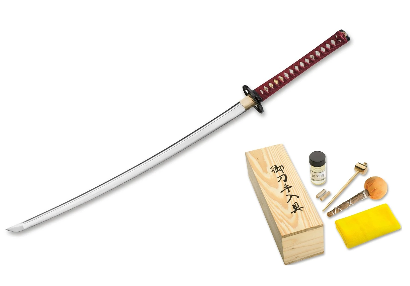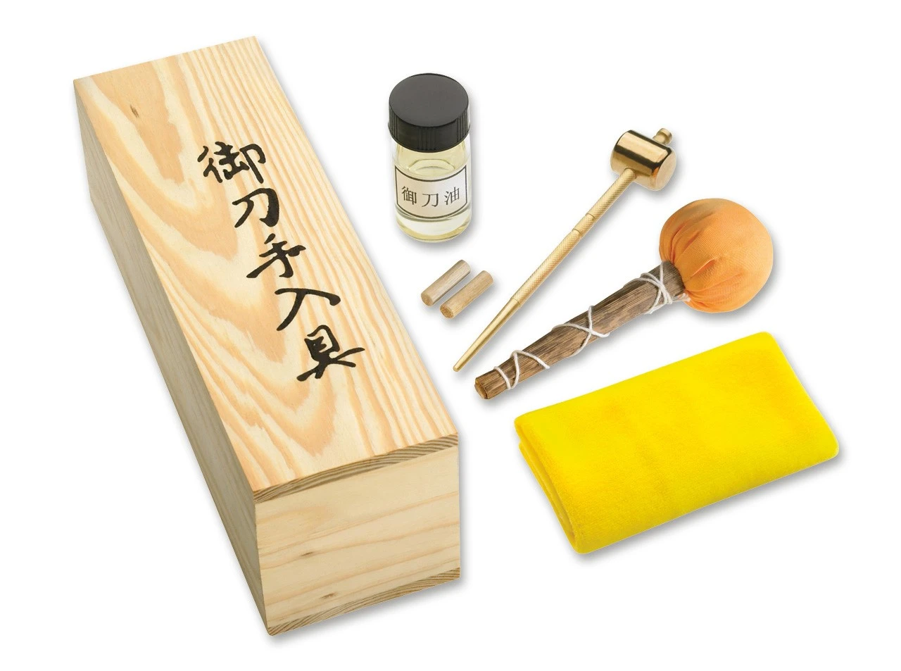 W zestawie znajduje się elegancka, drewniana pochwa oraz praktyczny komplet do pielęgnacji, co pozwala zadbać o wygląd produktu przez długi czas.