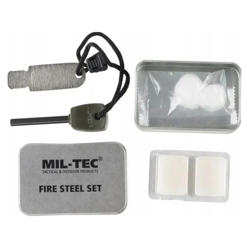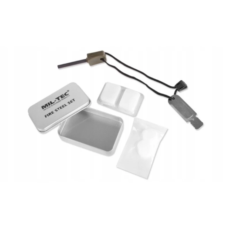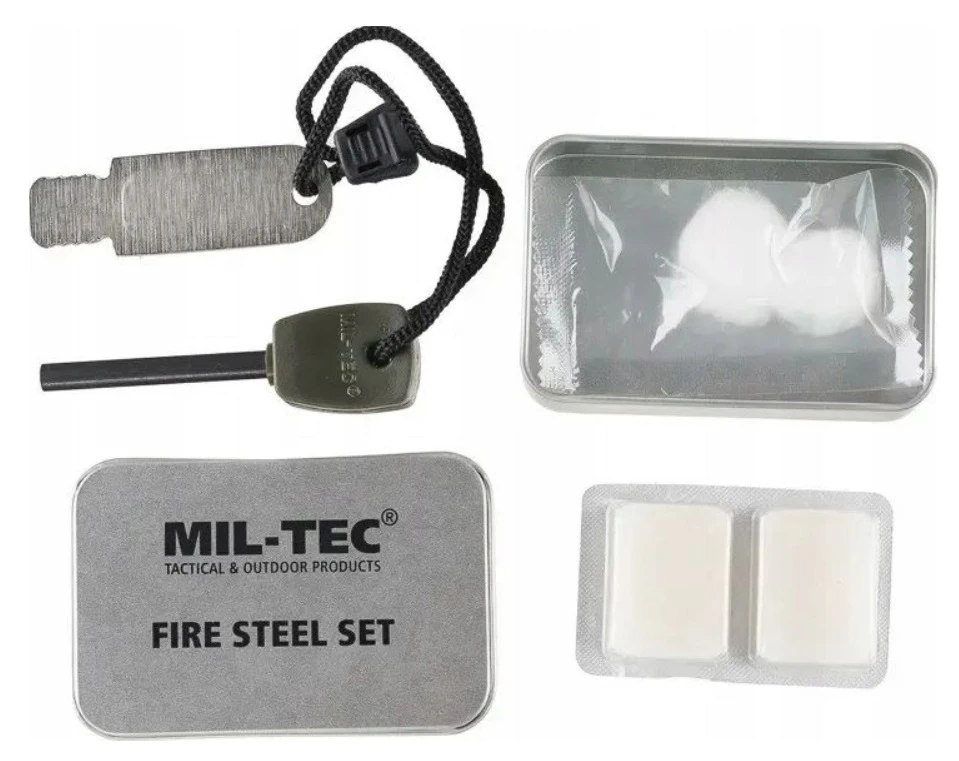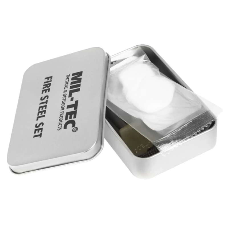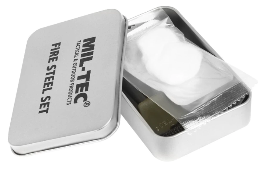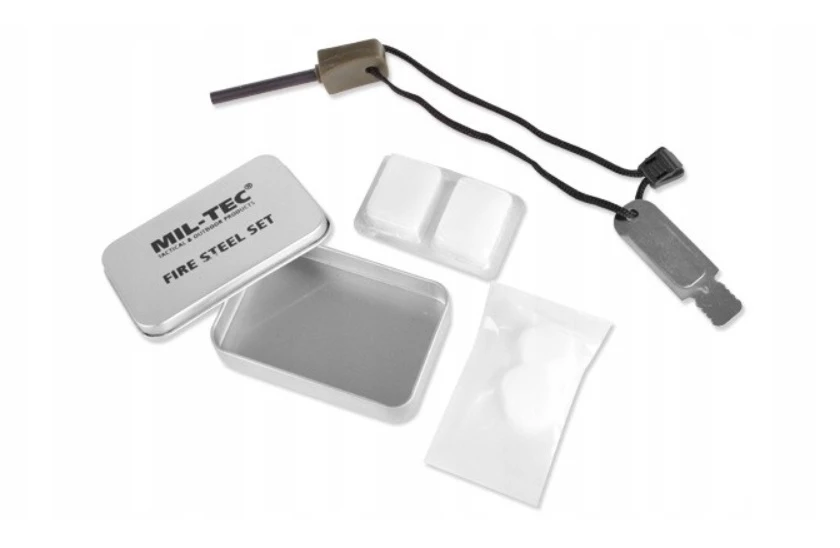 Zestaw zawiera krzesiwo do rozpalania ognia, watę bawełnianą oraz stałe paliwo typu Esbit - 2 kostki. Wszystko spakowane jest w metalowym, solidnym pudełku.