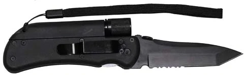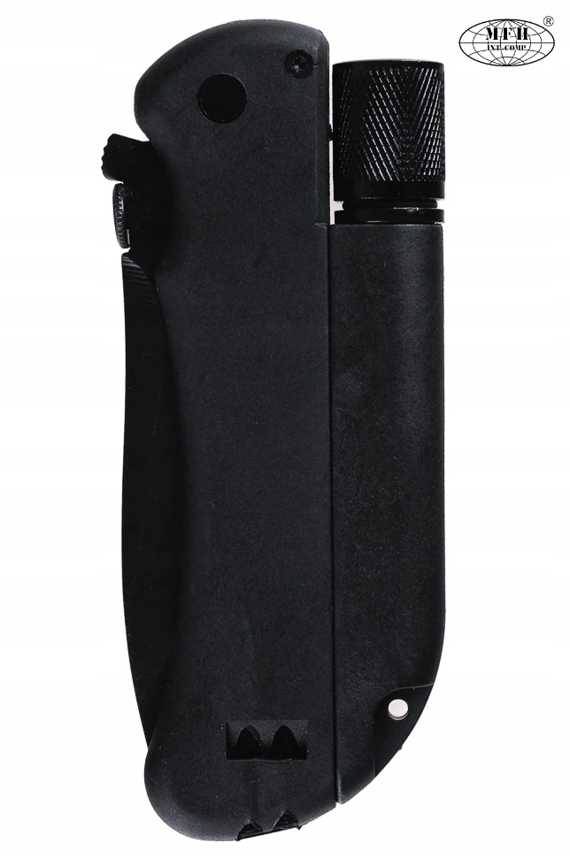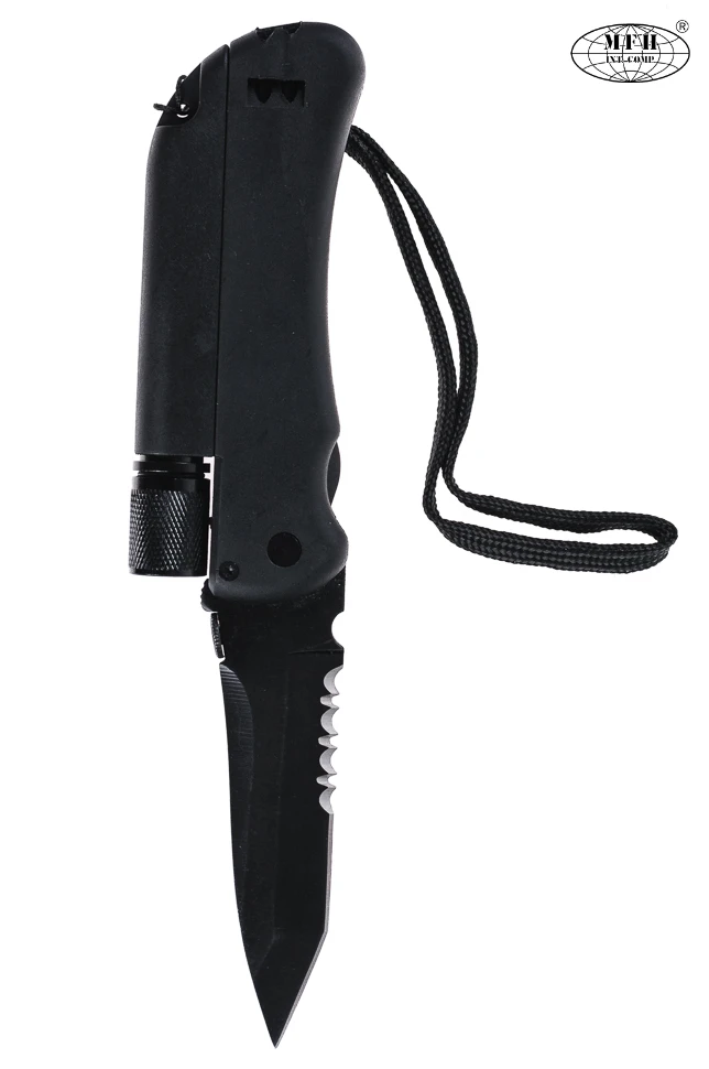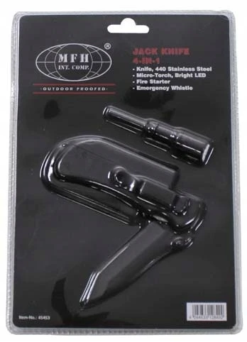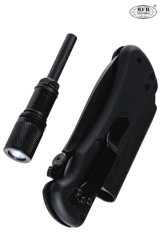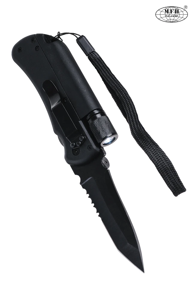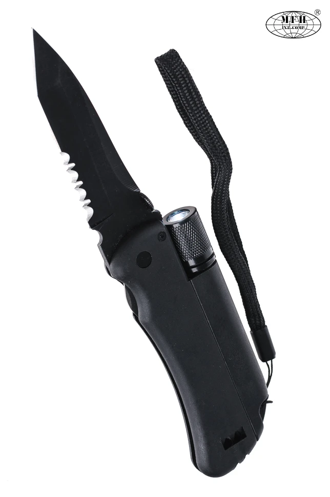Nóż survivalowy MFH to nóż składany z wbudowanym krzesiwem, mini latarką o dużej sile światła oraz gwizdkiem ratunkowym. Ostrze typu tanto podzielone jest na dwie części: gładką i ząbkowaną, co zapewnia uniwersalność jego użycia. Ostre można je otworzyć i złożyć za pomocą jednej ręki.